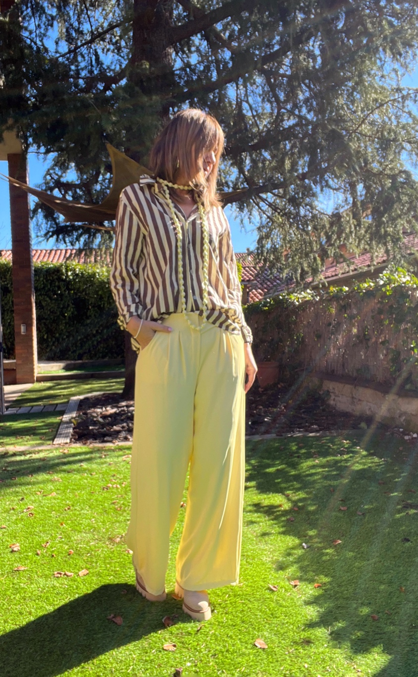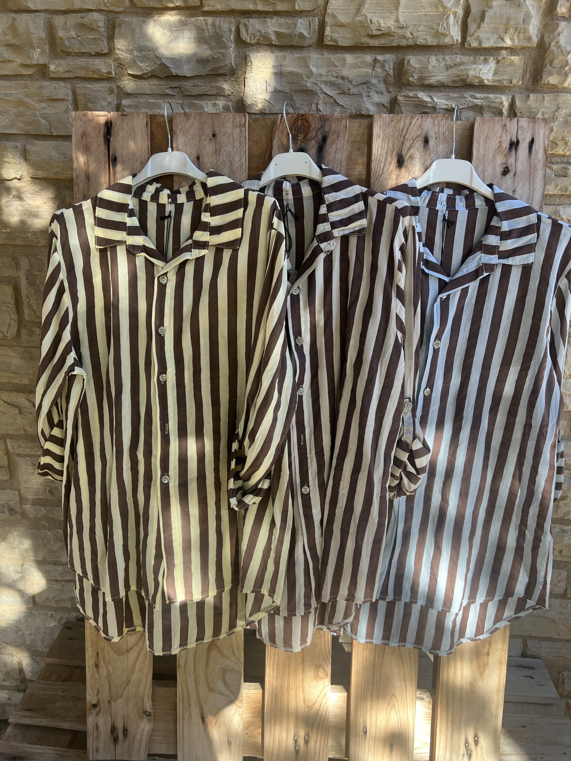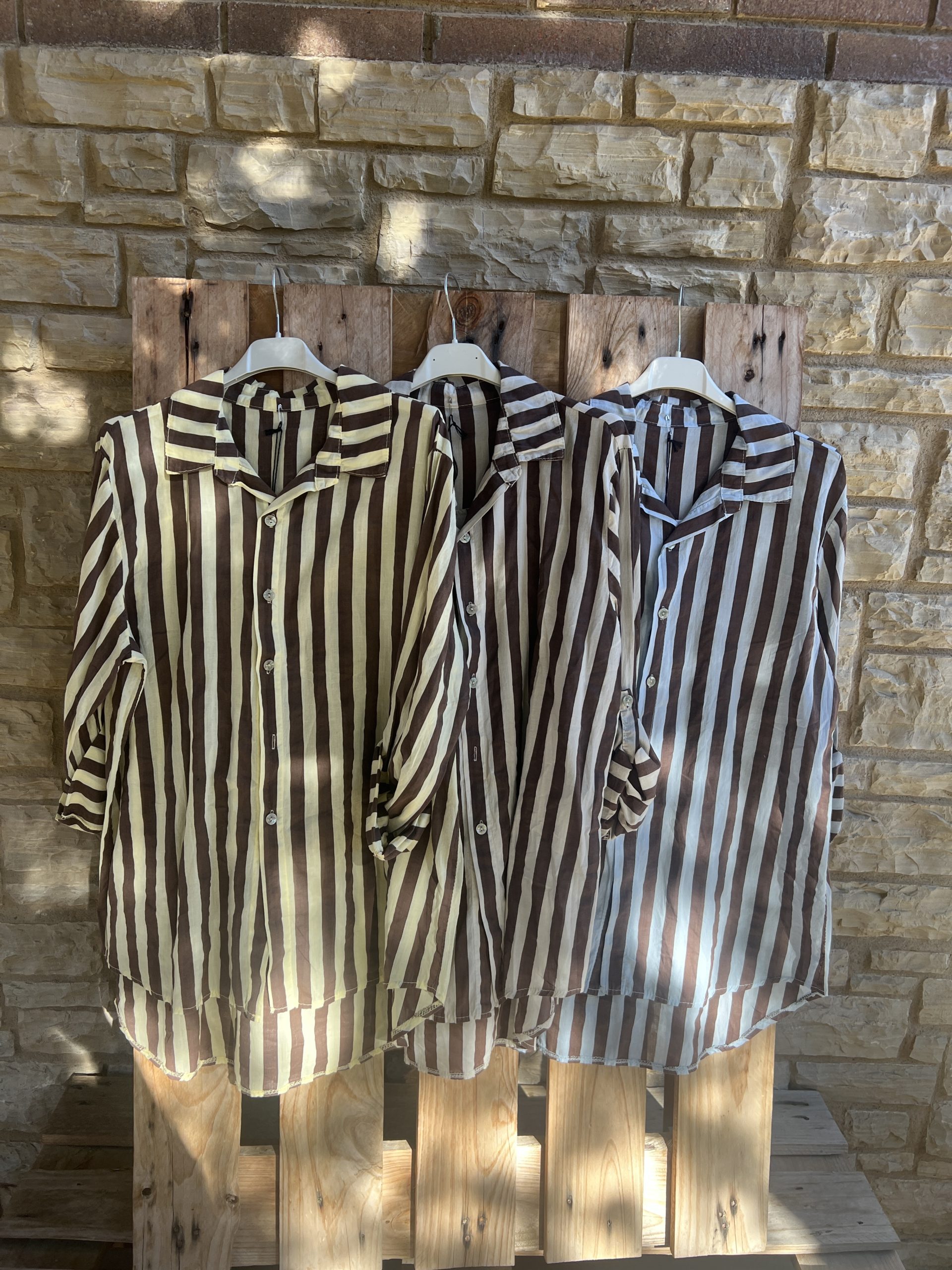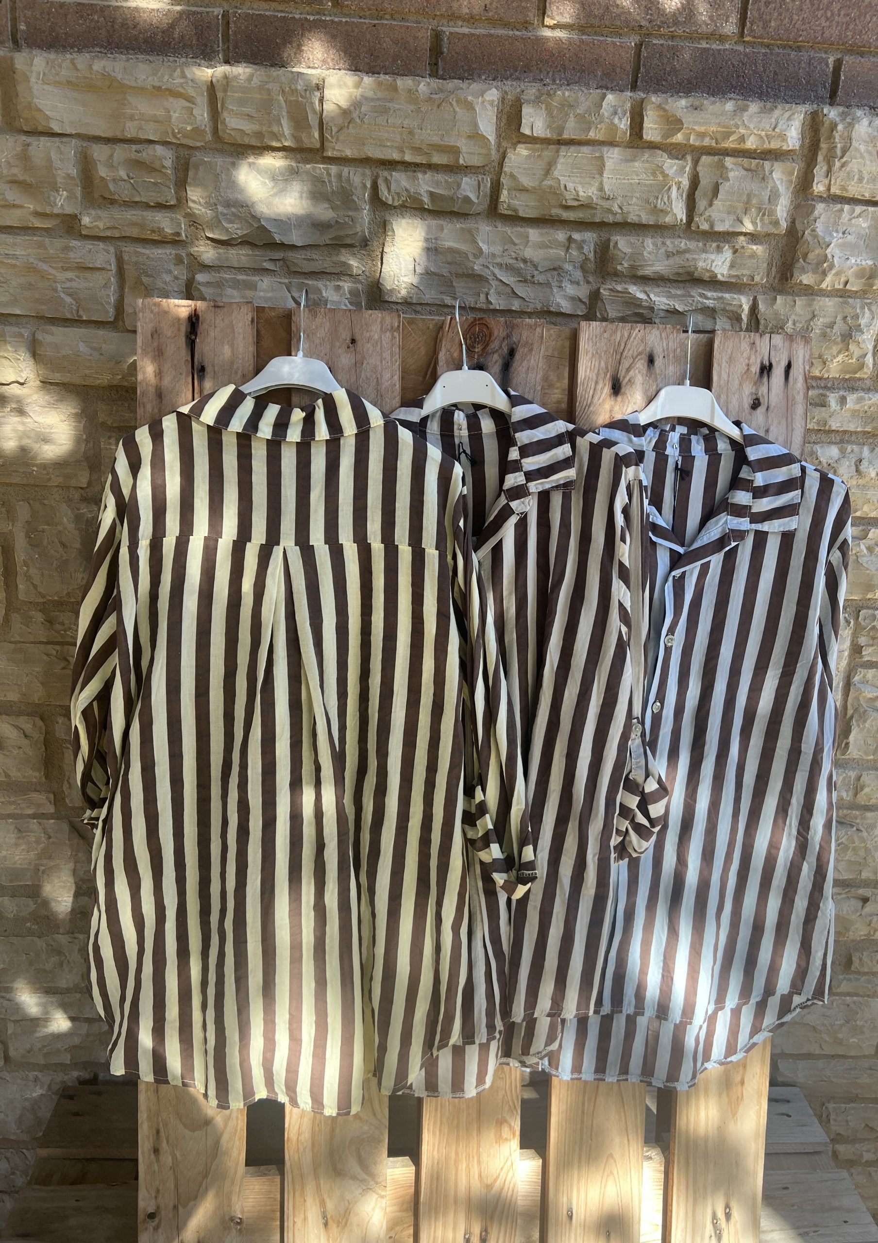 Blusa de mujer a rayas con cuello camisero, confeccionada en tejido ligero y cómodo. Presenta manga larga sin puño, con botón a media manga que permite recogerla y ajustarla para un look más informal. Su diseño versátil la hace ideal tanto para looks casuales como para conjuntos más arreglados.