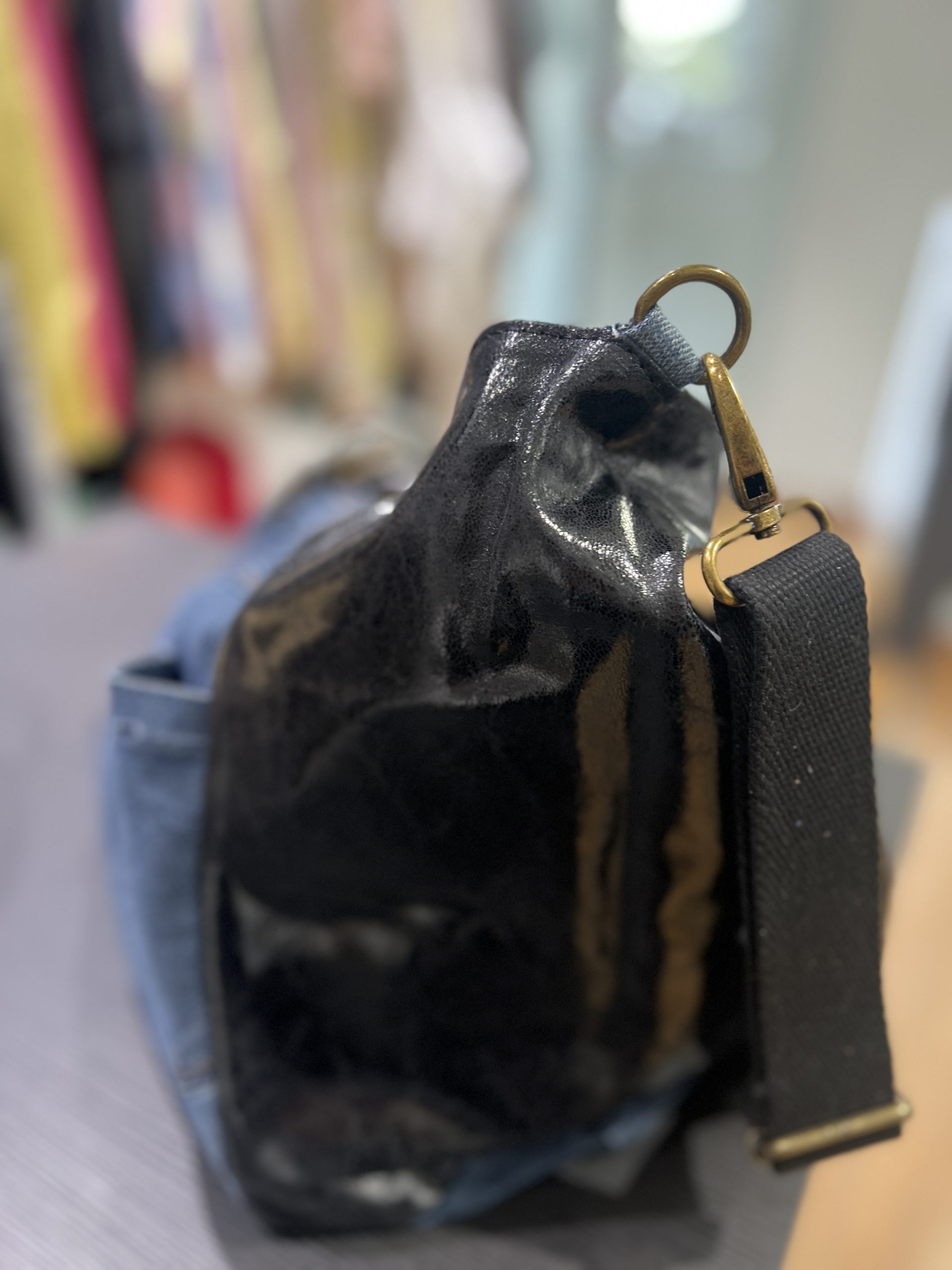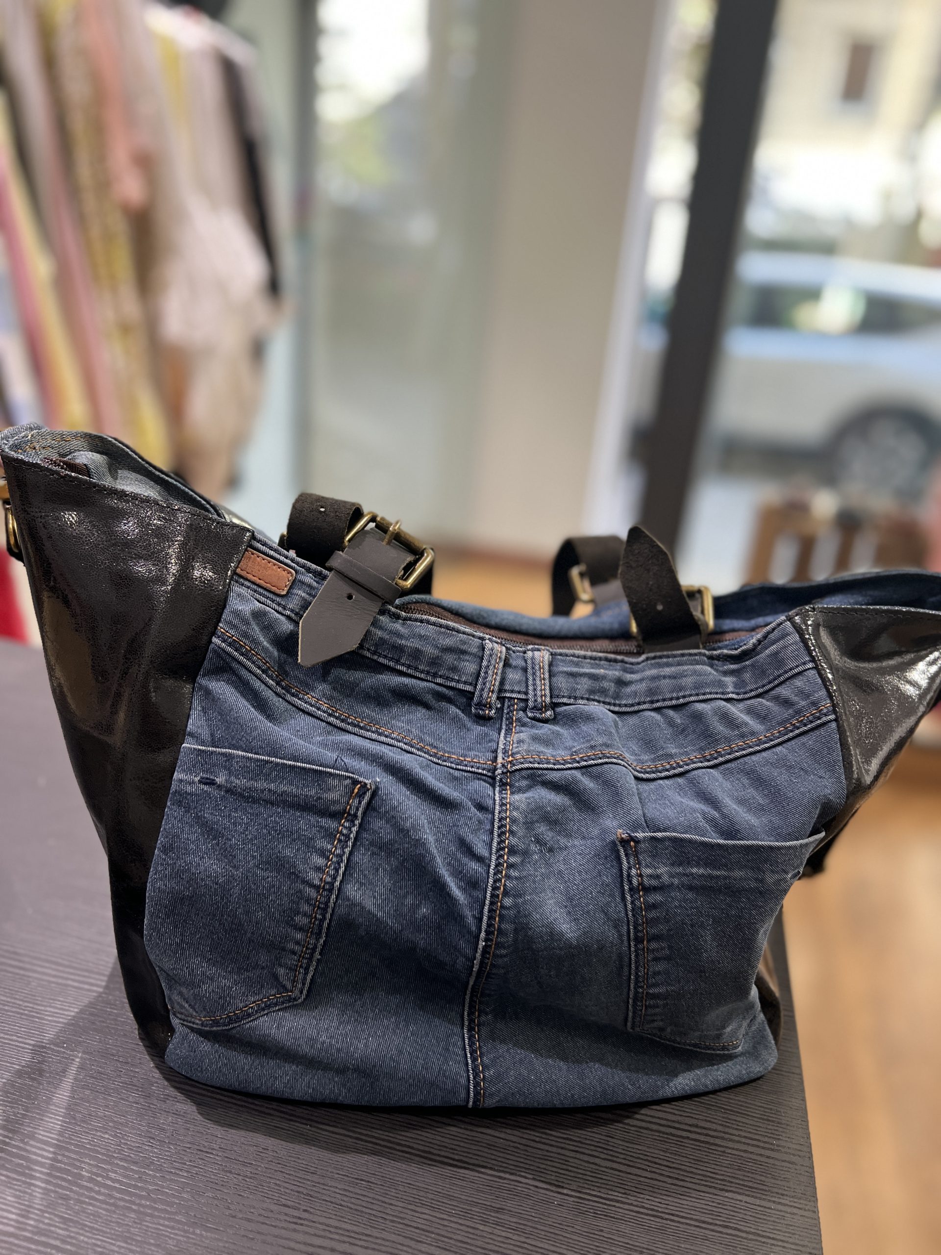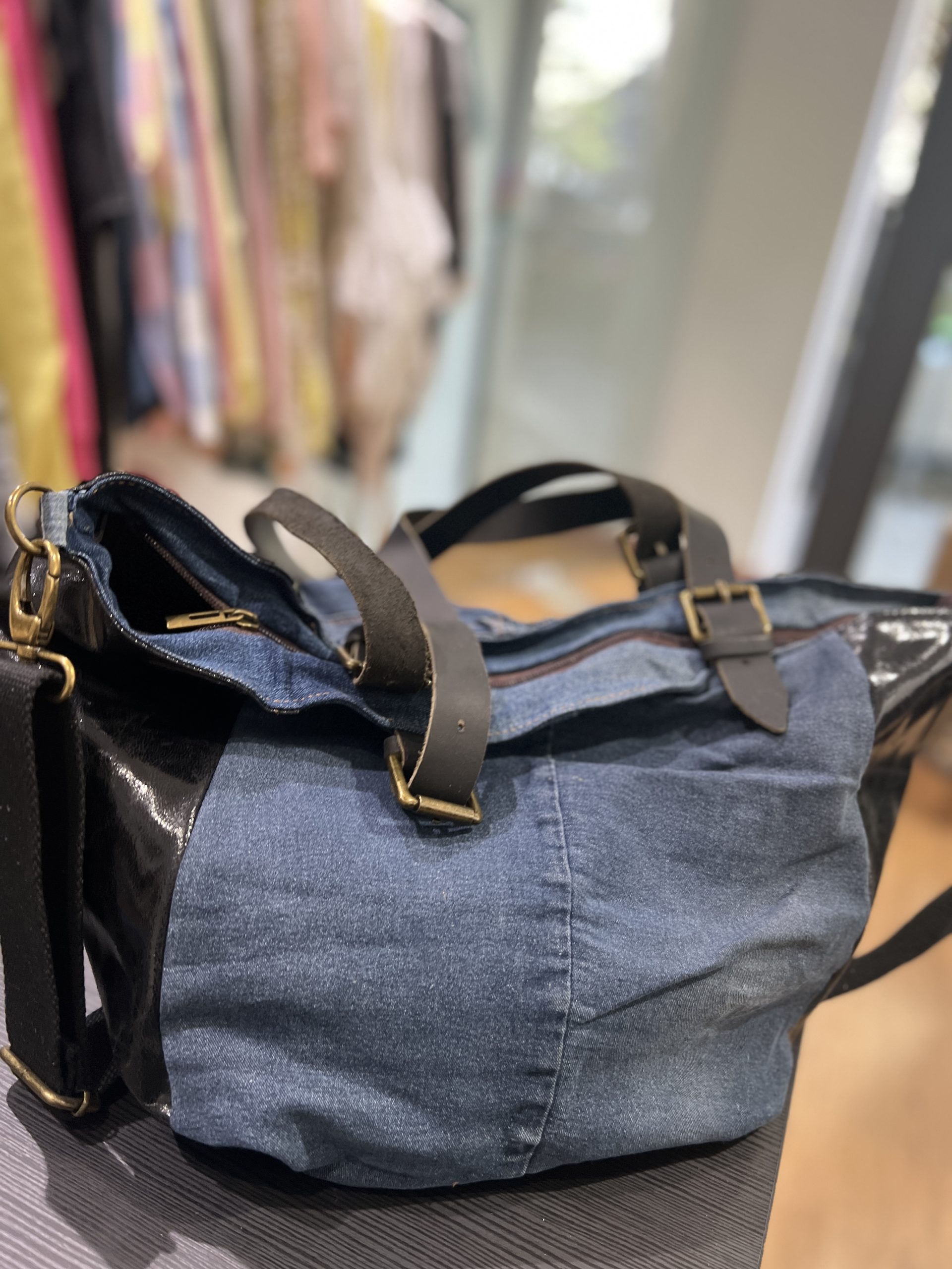 bolso de tejido vaquero con detalles laterales en ecopiel