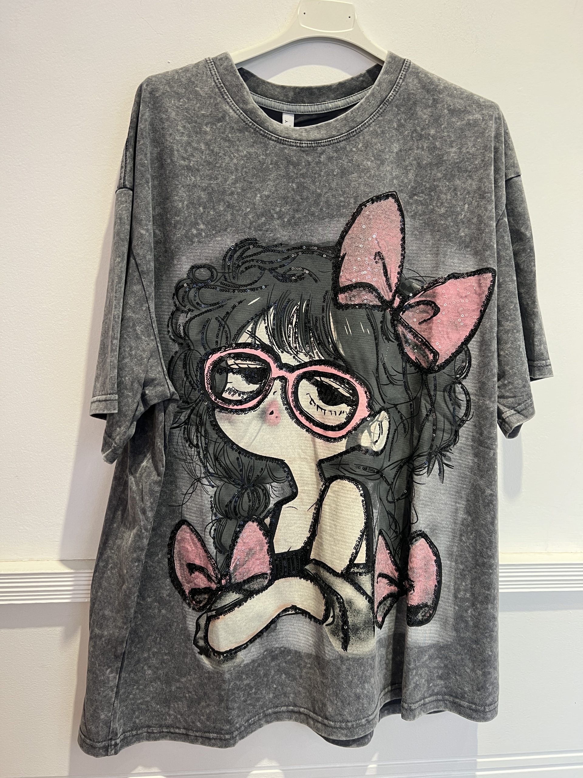 Camiseta de algodón talla única corte overzise estampado con strass y lentejuelas
