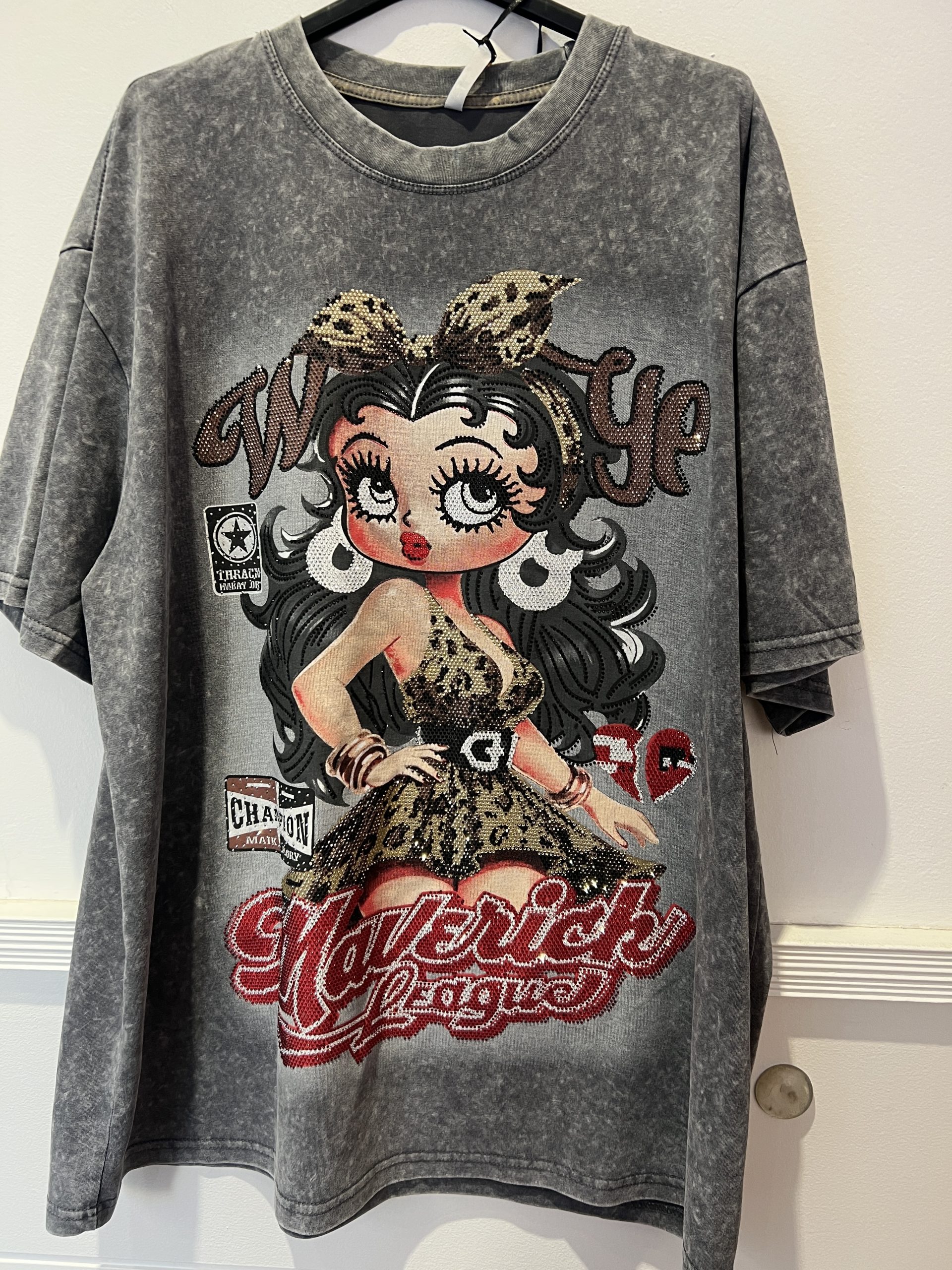 Camiseta de algodón talla única corte overzise estampado con strass y lentejuelas