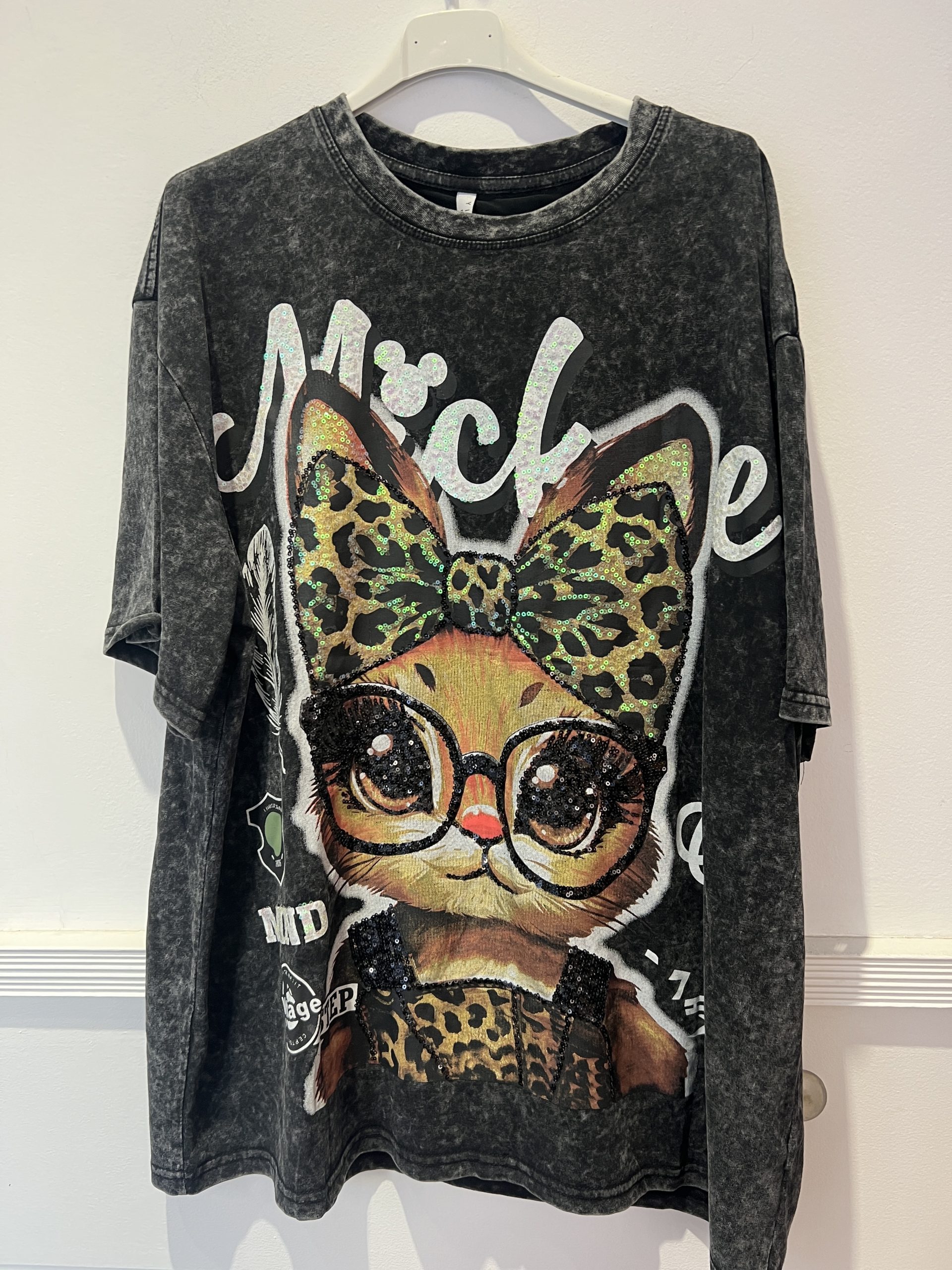 Camiseta de algodón talla única corte overzise estampado con strass y lentejuelas