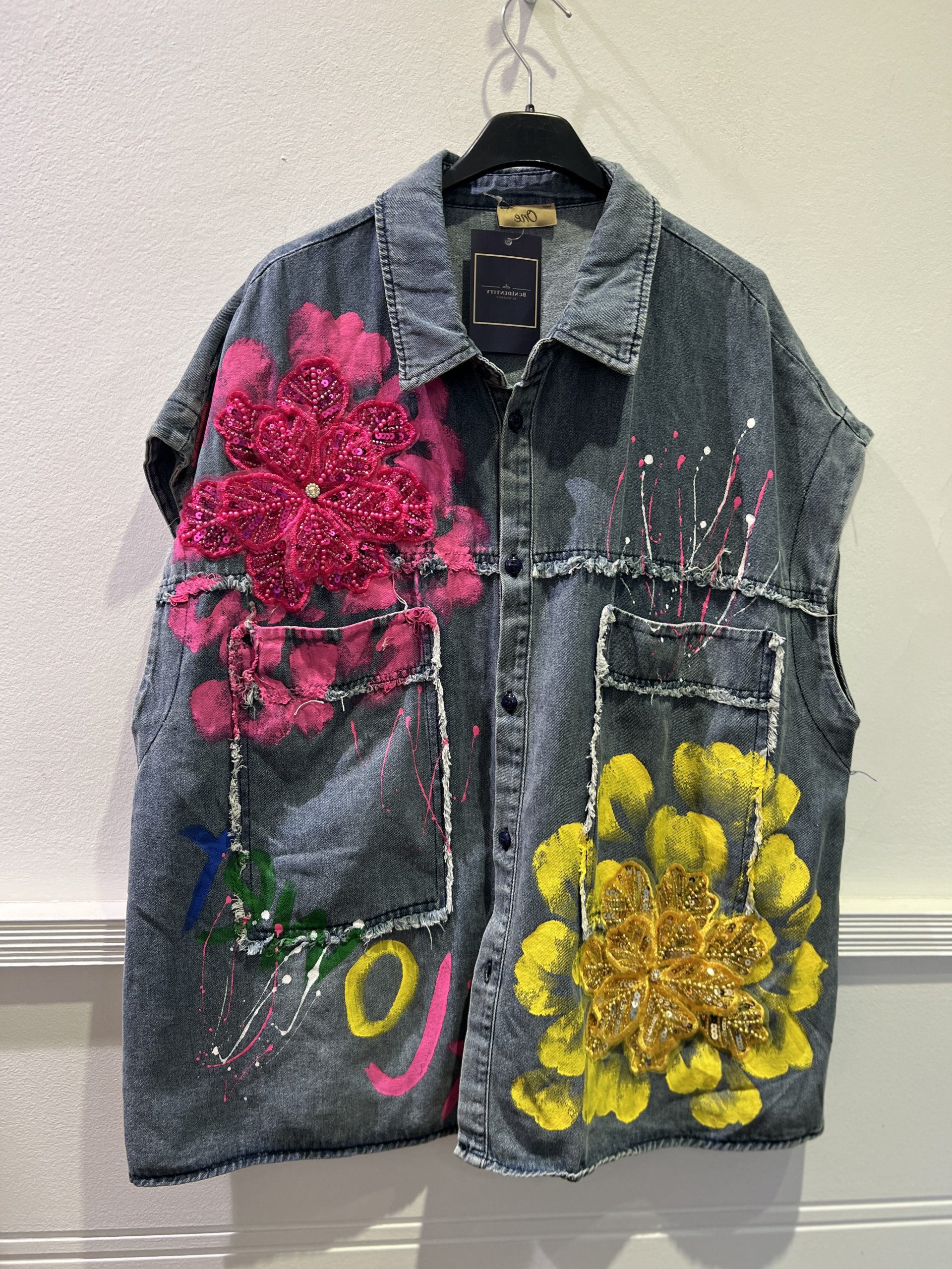 Chaleco de corte overzise de tejido vaquero, pintado a mano, con flores incrustadas, bordadas y con lentejuelas