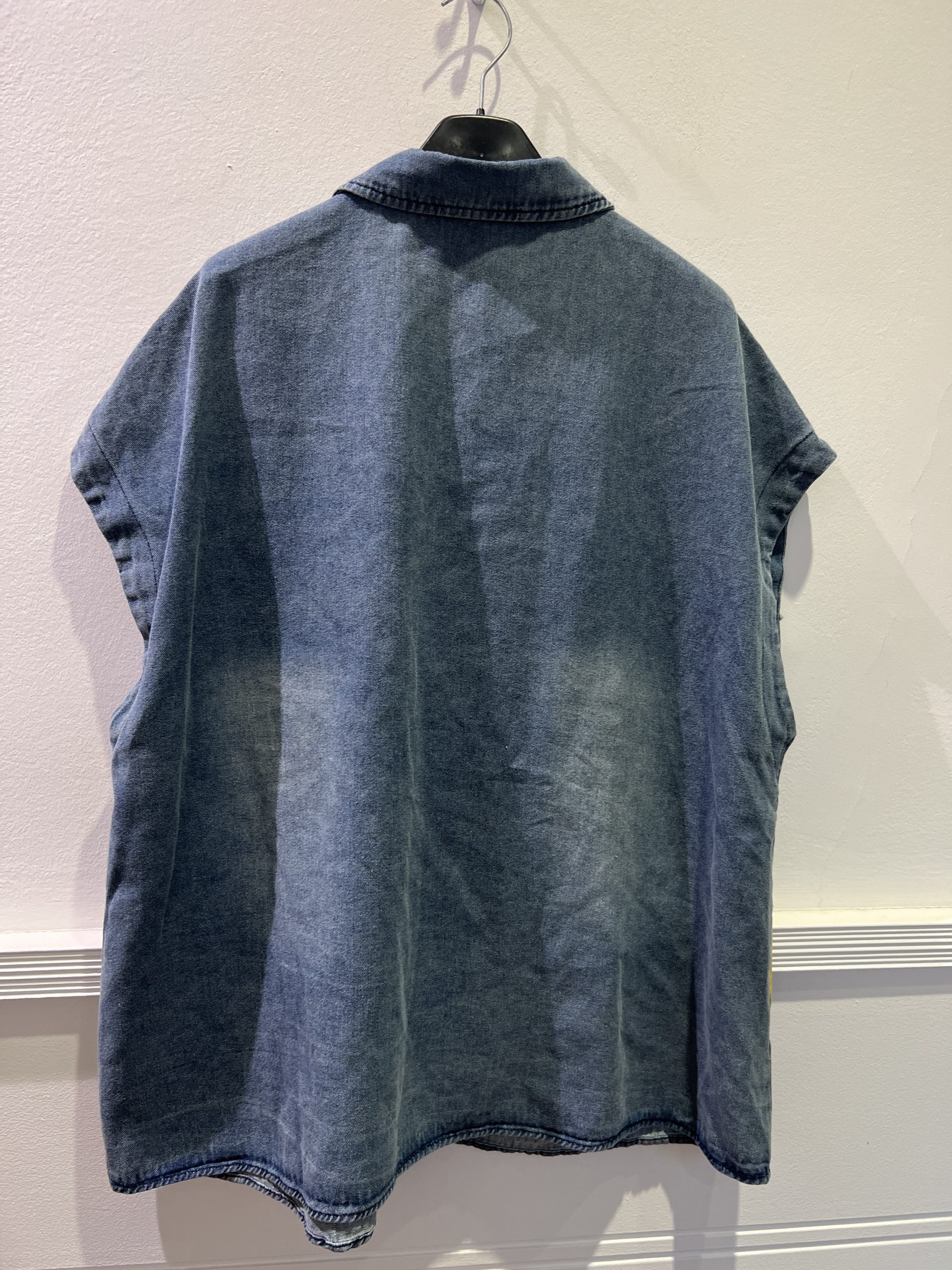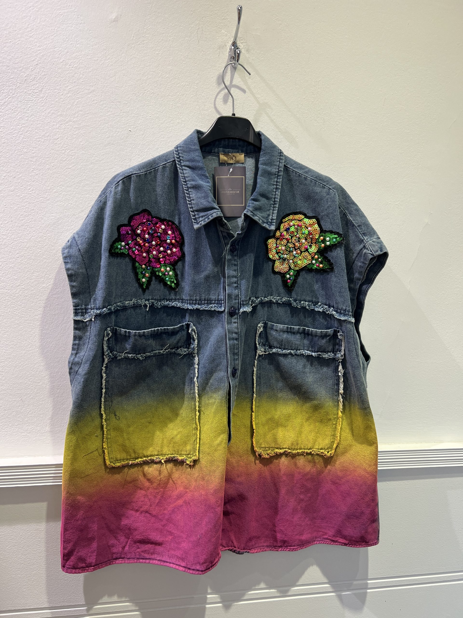 Chaleco de corte overzise de tejido vaquero, pintado a mano, con flores incrustadas, bordadas y con lentejuelas