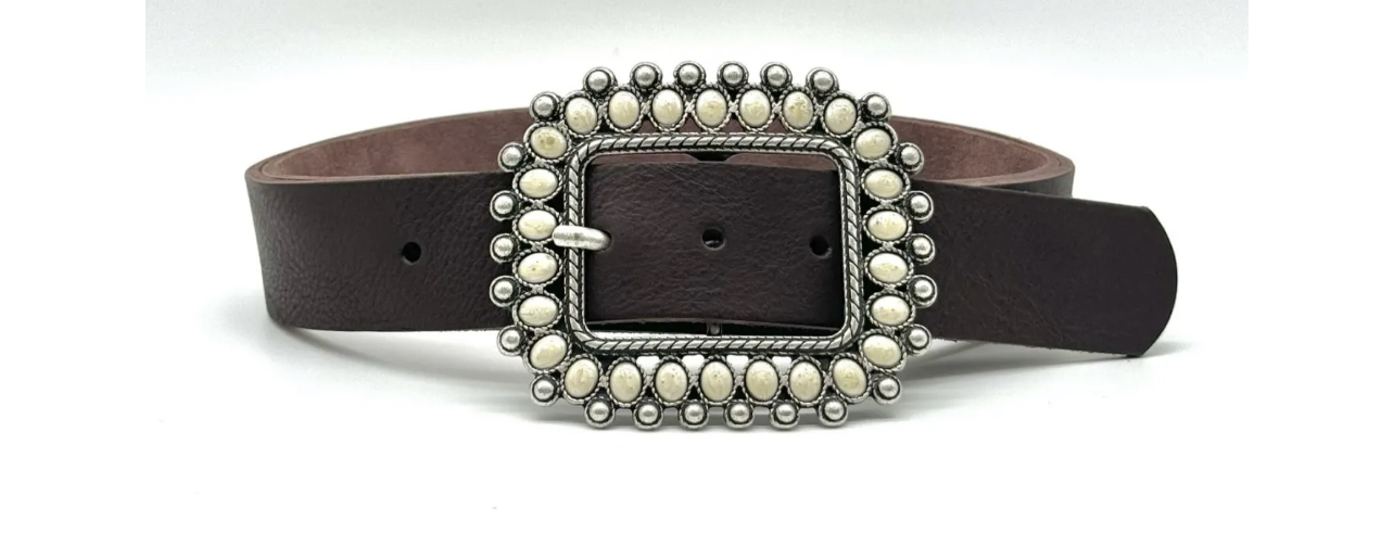 Cinturón de piel con hebilla metálica y hojas nacaradas