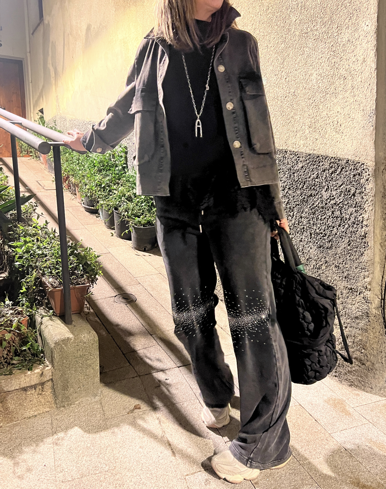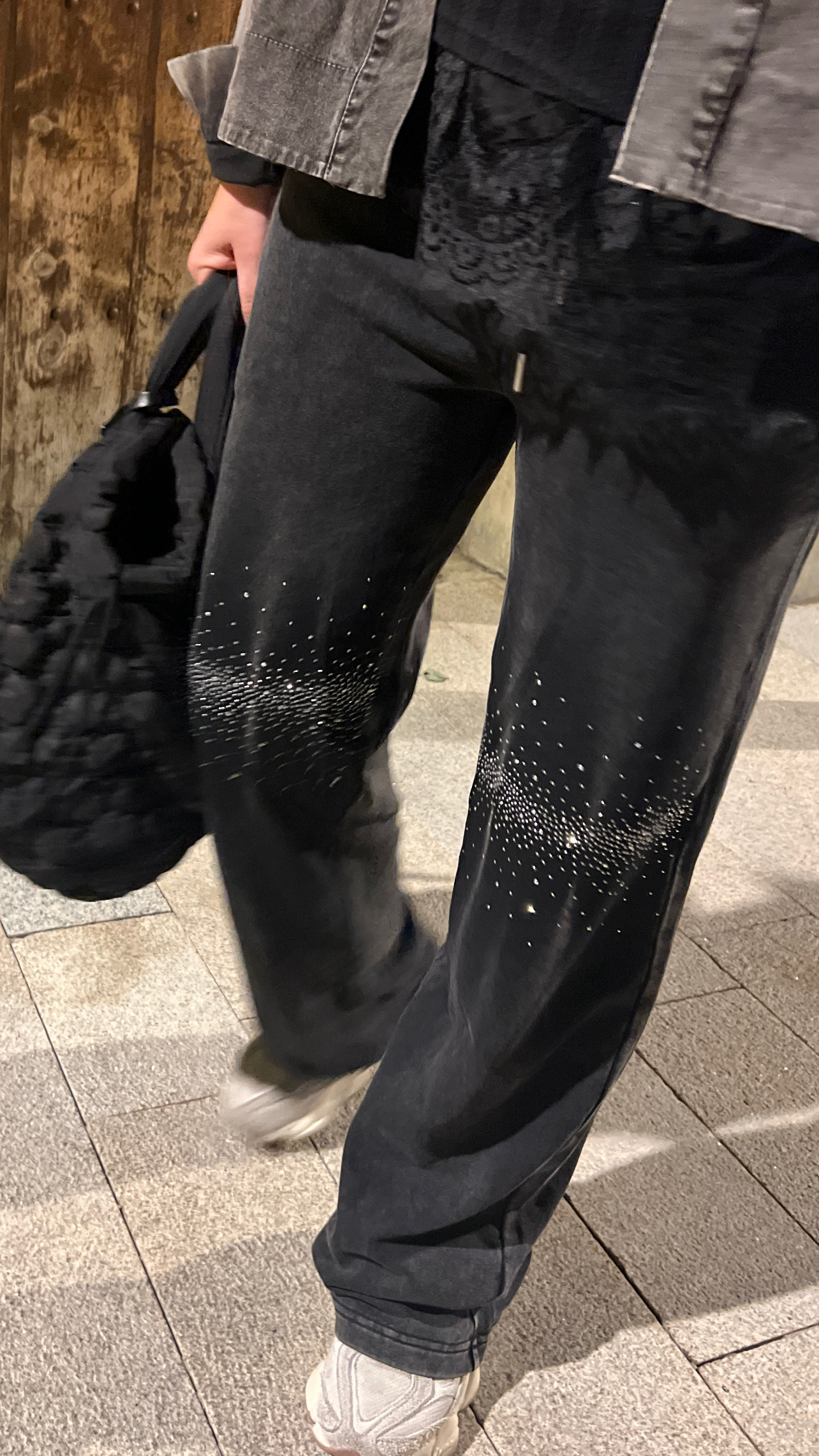 Pantalón recto de algodón con diseño urbano. Incorpora strass en las rodillas y un suave degradado en la parte trasera que aporta un toque moderno y diferencial.