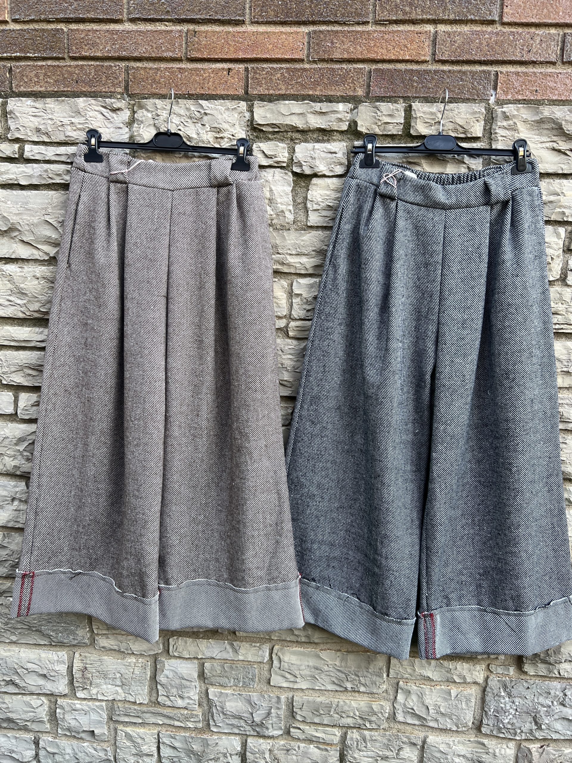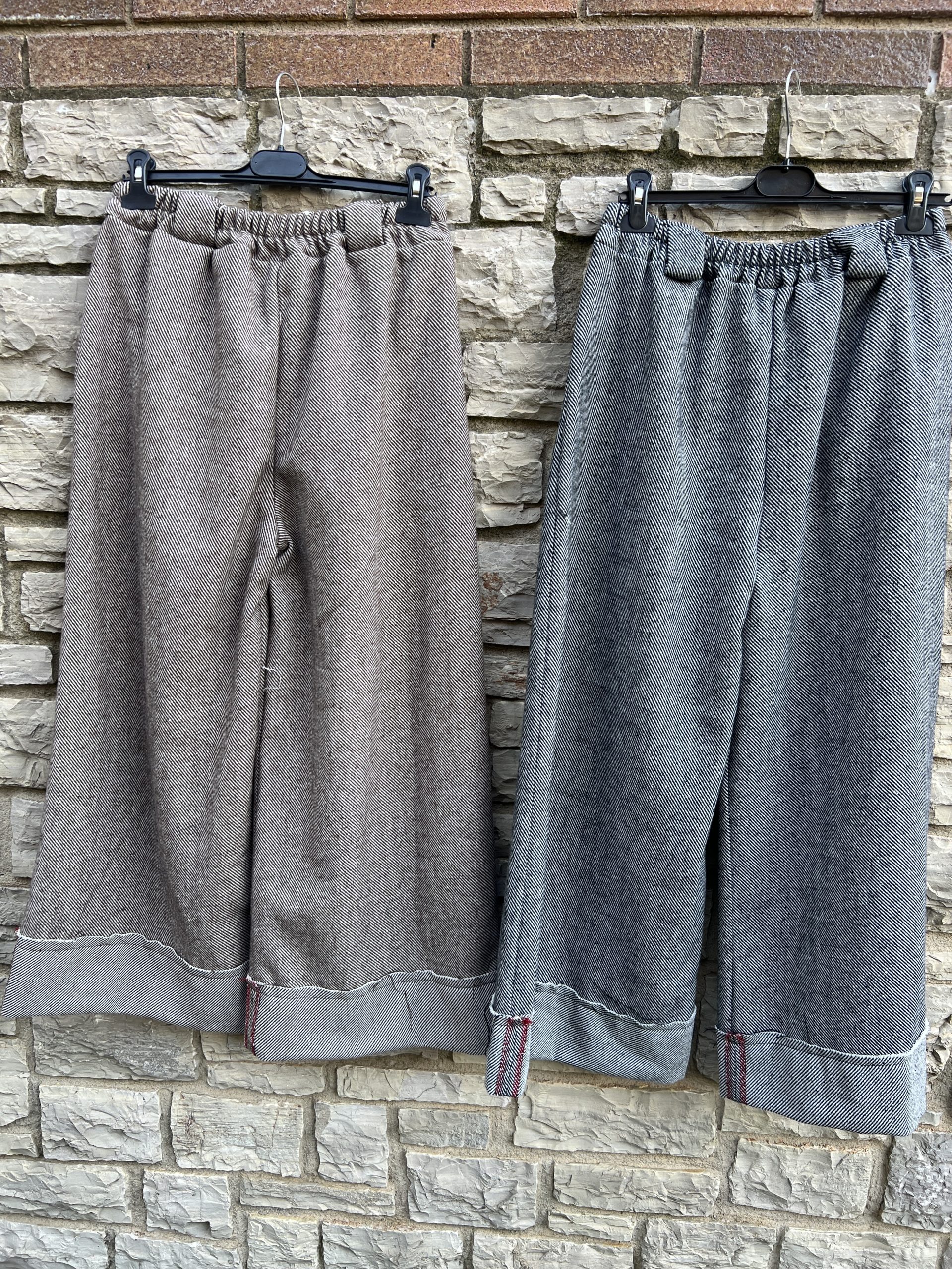 Pantalón de franela jaspeado de corte ancho, goma en cintura ( sin cremallera) bolsillos laterales, pinza en parte delantera y gran dobladillo en el bajo