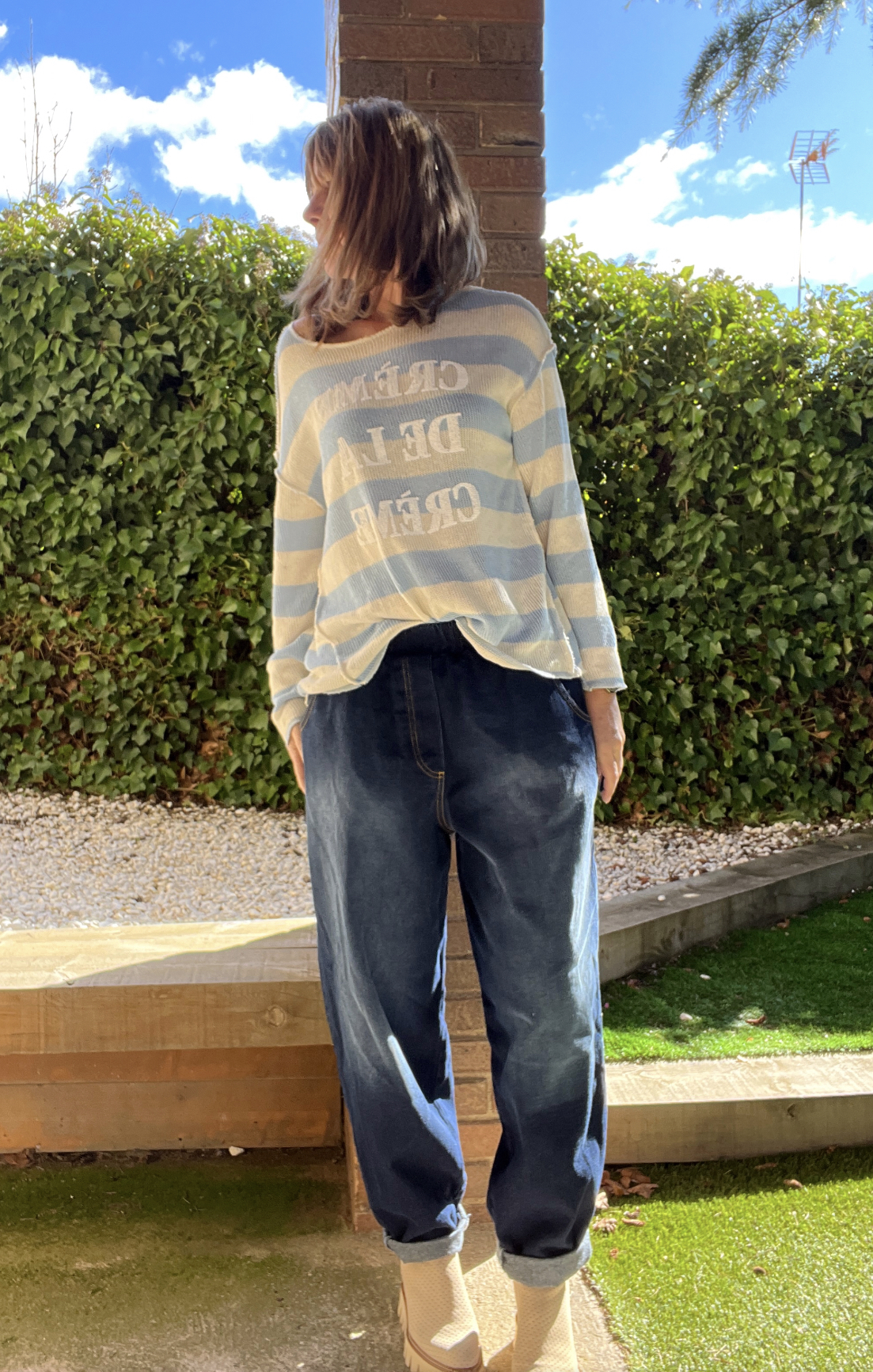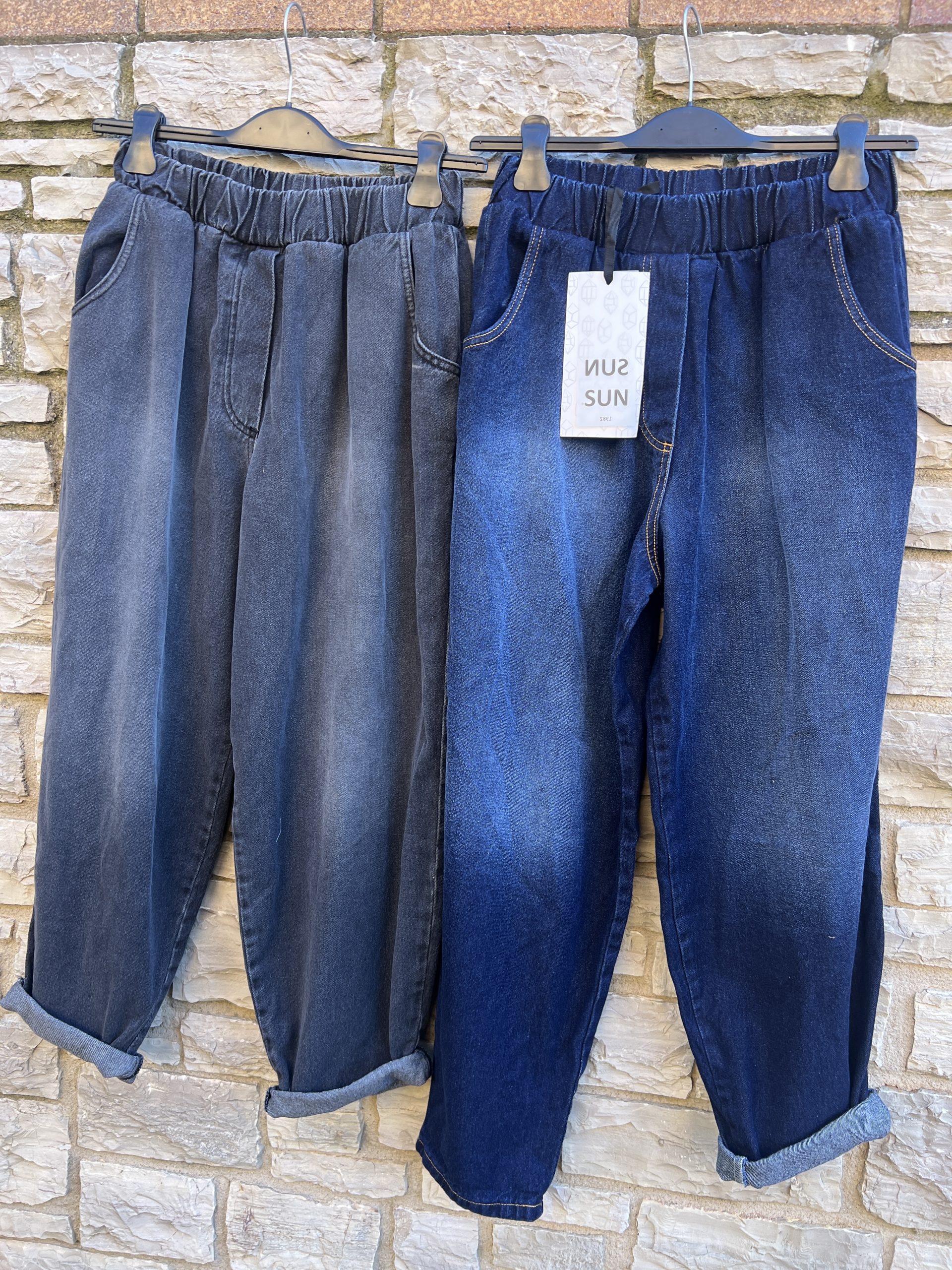 Pantalon vaquero de corte abombachado, cintura engomada, bolsillos laterales y falsos bolsillos traseros