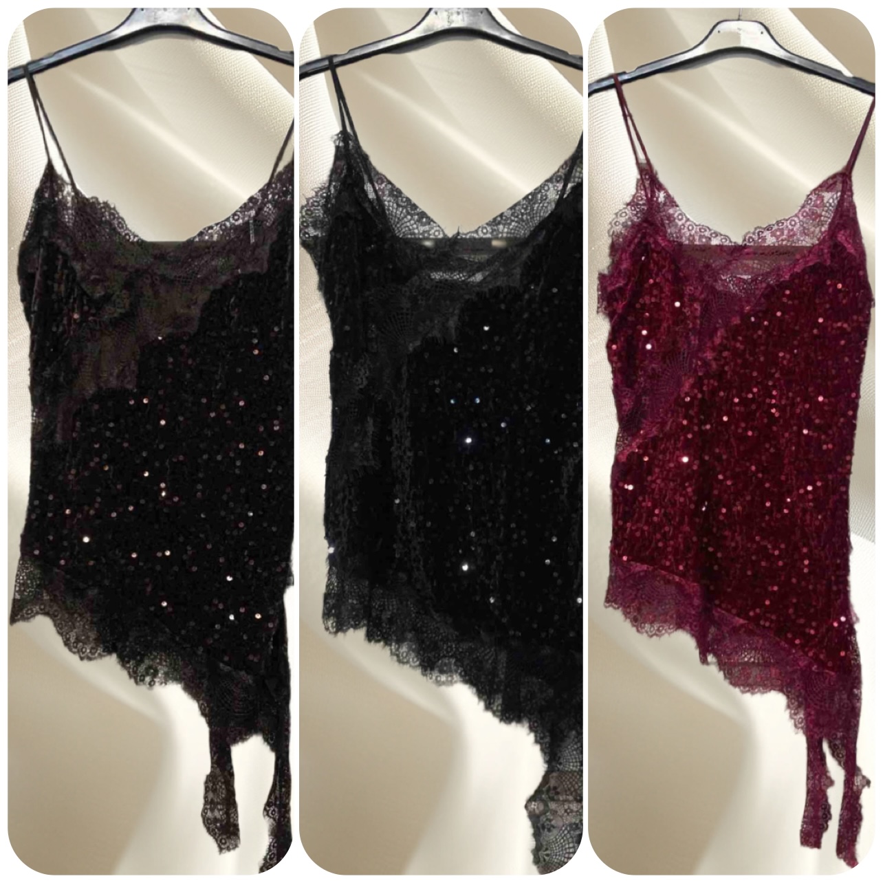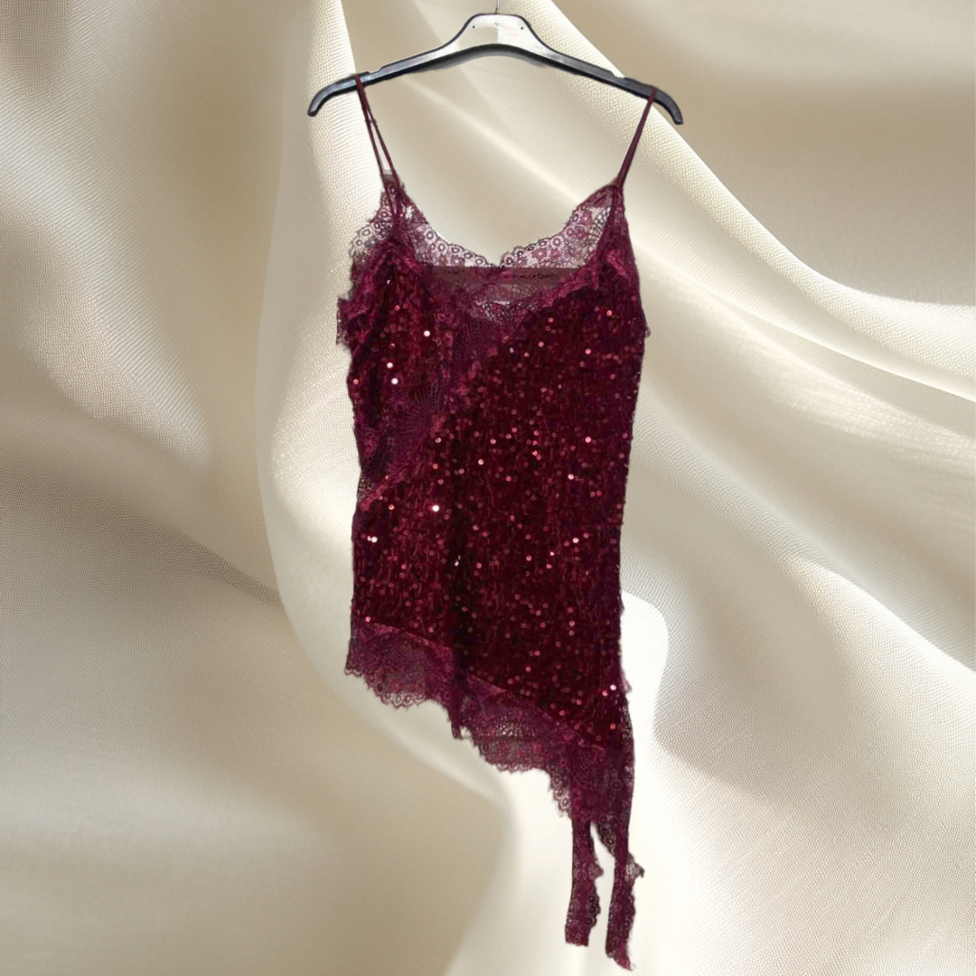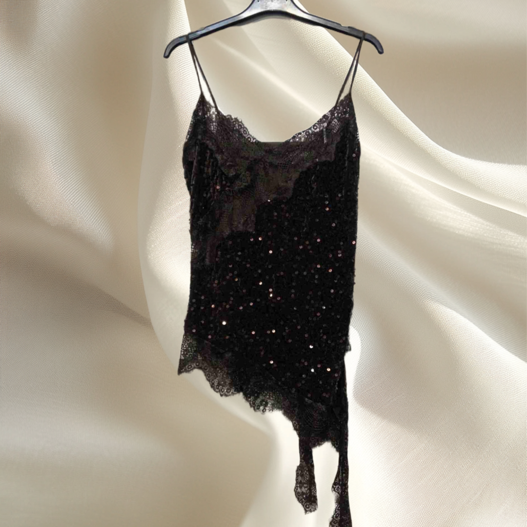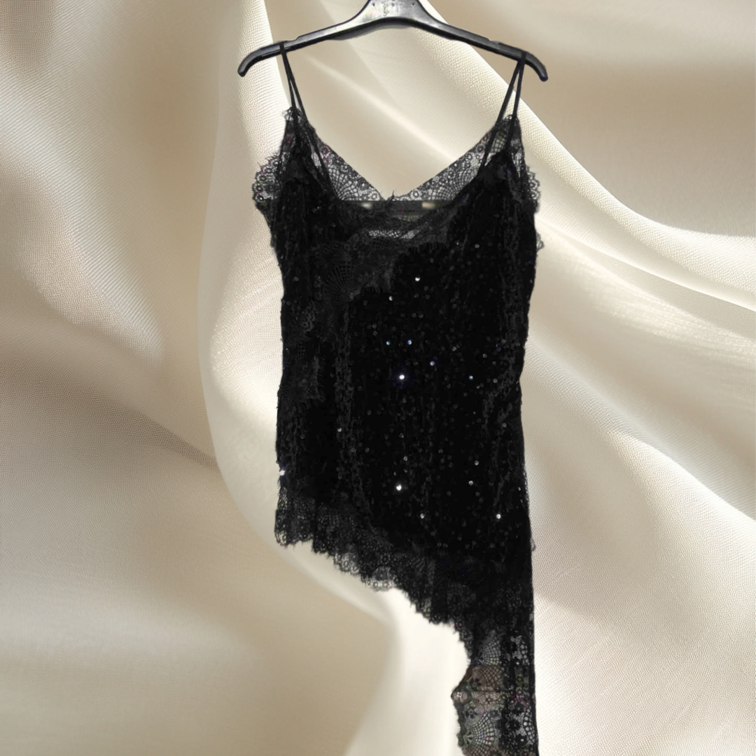 Top de lentejuelas de corte asimétrico y con acabado en blonda  (escote y bajo)